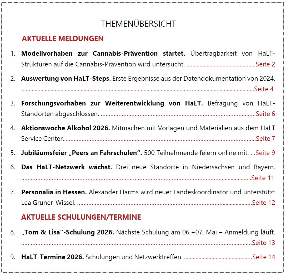 Um dieses Ziel zu erreichen, wenden wir uns direkt an die Jugendlichen und ihre Eltern, aber auch an Erwachsene, die in Kontakt mit Jugendlichen stehen (z. B. Lehrer/-innen, Trainer/-innen). Unser Schwerpunkt: Wir informieren, beraten und schulen Jugendliche und Erwachsene zum Thema Jugendschutz und risikoarmer Umgang mit Alkohol. HaLT besteht aus den zwei Programmbereichen HaLT-reaktiv und HaLT-proaktiv mit unterschiedlichem Fokus: