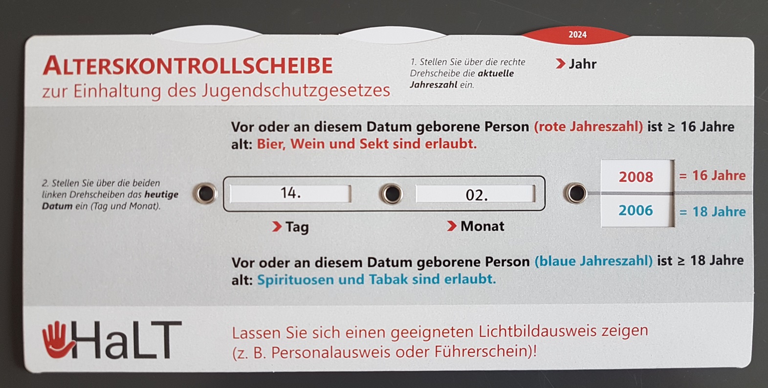 Ist der/die Jugendliche bereits 16 Jahre alt? In der Hektik des Verkaufs ist dies manchmal eine schwierige Rechenaufgabe für das Verkaufspersonal. Die Alterskontrollscheibe hilft, das Alter des/der Jugendlichen schnell zu bestimmen.